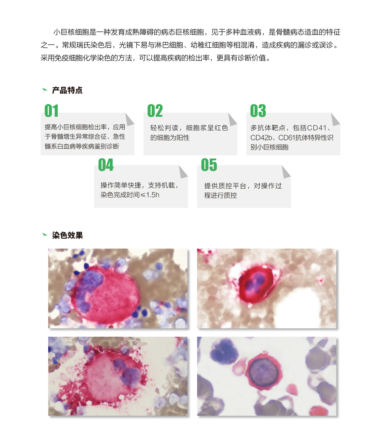骨髓小巨核细胞是一种发育成熟障碍的病态巨核细胞,见于多种血液病,是骨髓病态造血的特征。常规瑞氏染色后,光镜下易与淋巴细胞、幼稚红细胞等相混淆,造成疾病的漏诊或误诊。用免疫细胞化学染色的方法,可以提高骨髓小巨核细胞的检出率,更具有诊断价值。