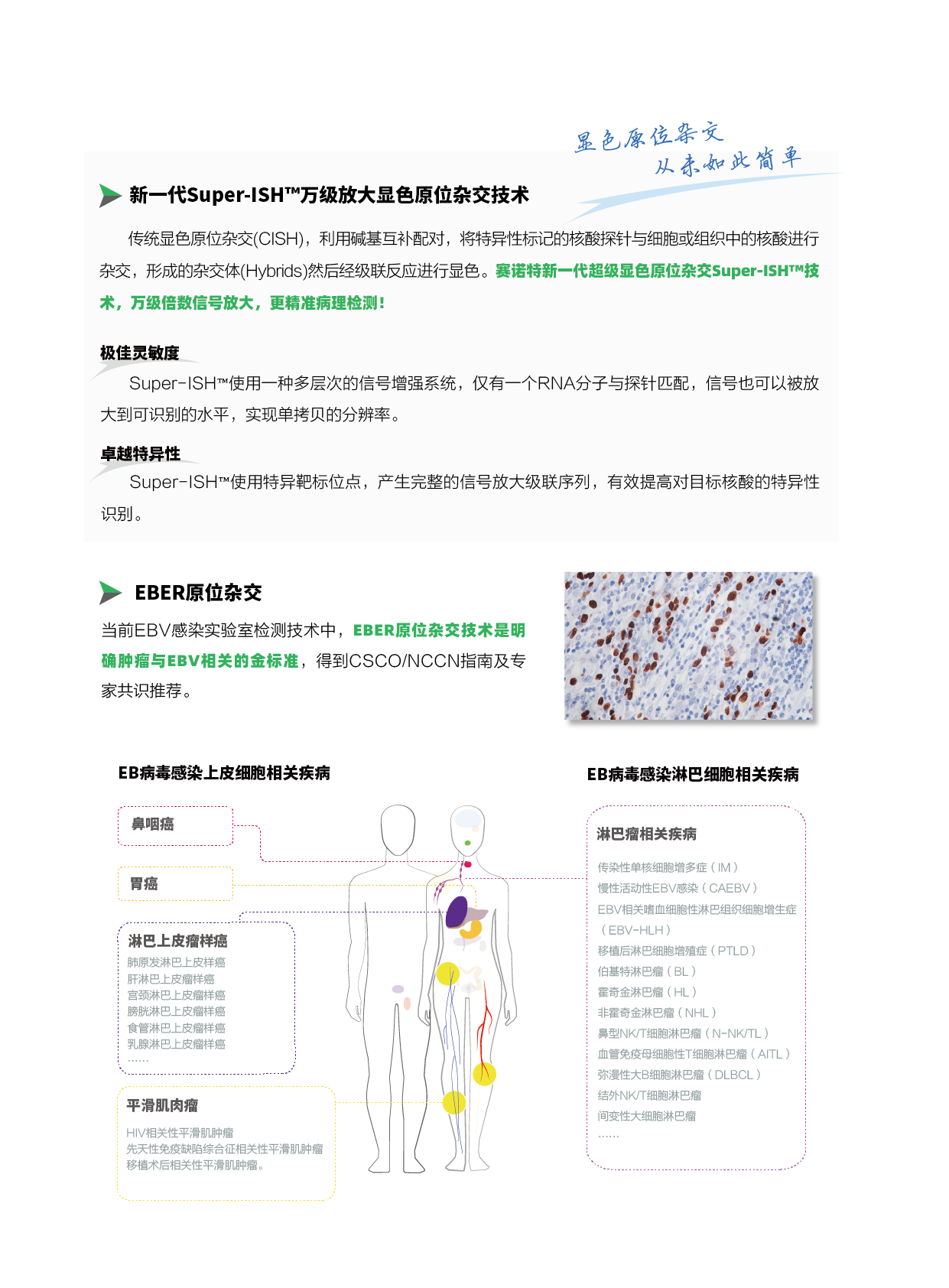 显色原位杂交(CISH),利用碱基互补配对原则,将特异标记的核酸探针与细胞或组织中的核酸进行杂交,形成的杂交体经级联进行显色。为实现更灵敏的检测,赛诺特新—代显色原位杂交Super-lSH™技术,通过过设计特异探针构建级联检测系统,非扩增的条件下,信号放大万倍, 实现灵敏度增加, 同时保持容易开展的优点,为更精准的病理检测与诊断提供帮助。