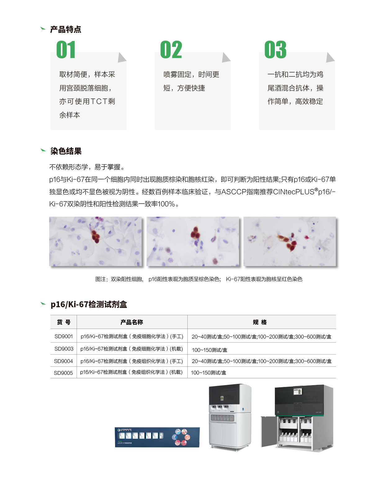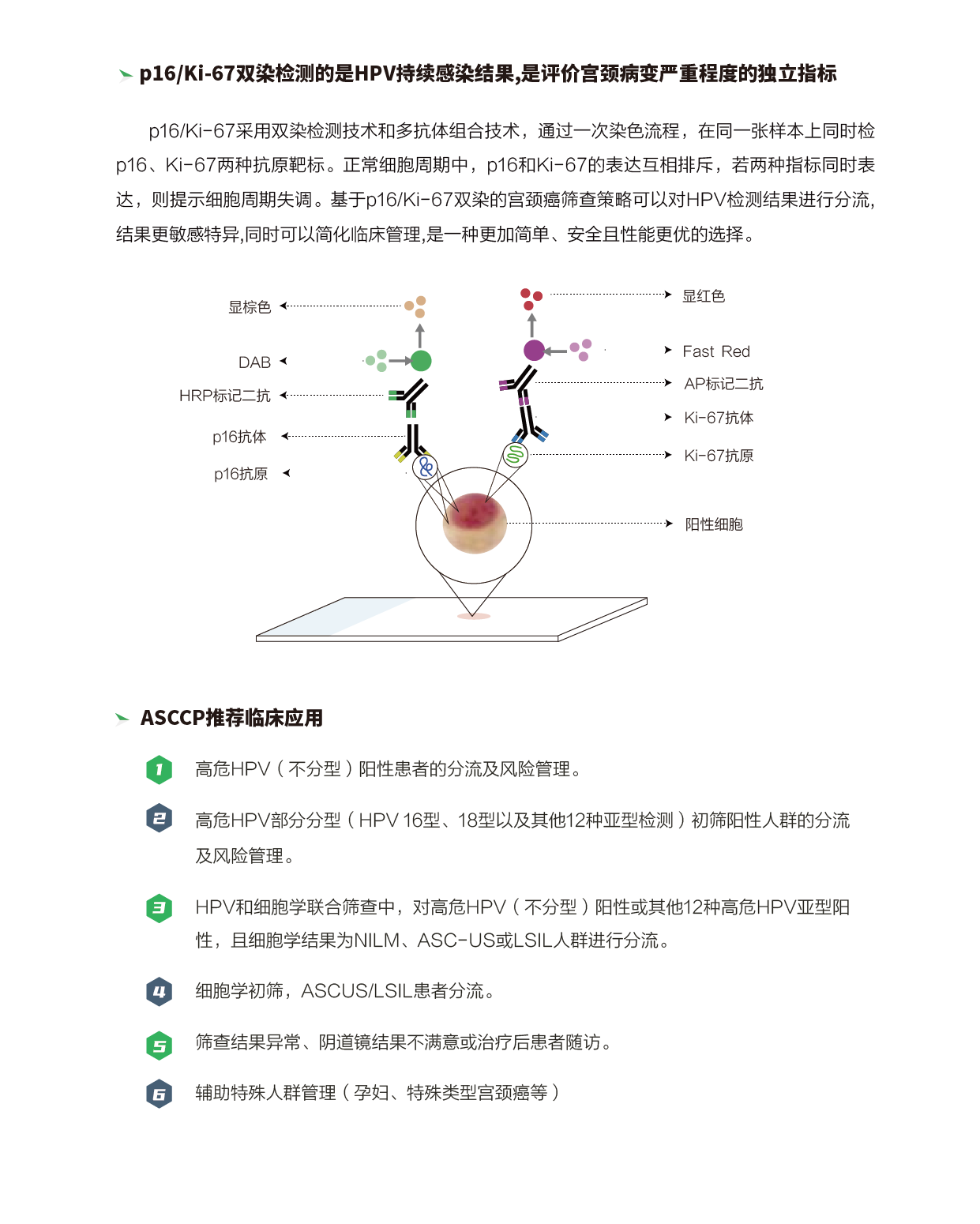 采用双染检测技术和多抗体组合技术,通过一次染色流程,在同一张样本上同时检p16、Ki67两种抗原靶标。正常细胞周期中,p16和Ki-67在同一细胞的表达互排斥,若这两种指标同时表达,则提示细胞周期调控失调。p16/Ki-67双染在用于HPV阳性而细胞学阴性、ASC-US和LSIL人群的分流中对提高≥CINⅡ的检出率具有良好的诊断准确性,具有重要的临床应用价值。