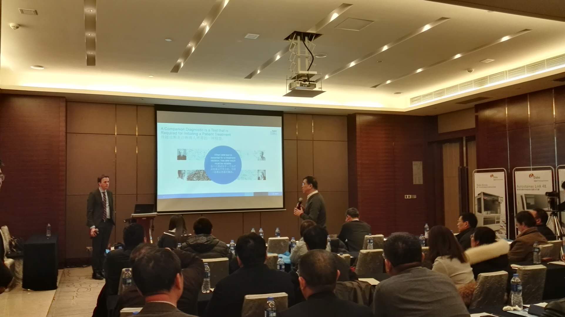 随后DAKO市场部邵悦发言,为在座的各位专家提供了原位杂交解决方案,伴随诊断解决方案,实验室管理解决方案等。技术支持陈曦对实验室的完整解决方案进行详细的说明,实验室解决方案包含全自动免疫组化系统&原位杂交系统等。
