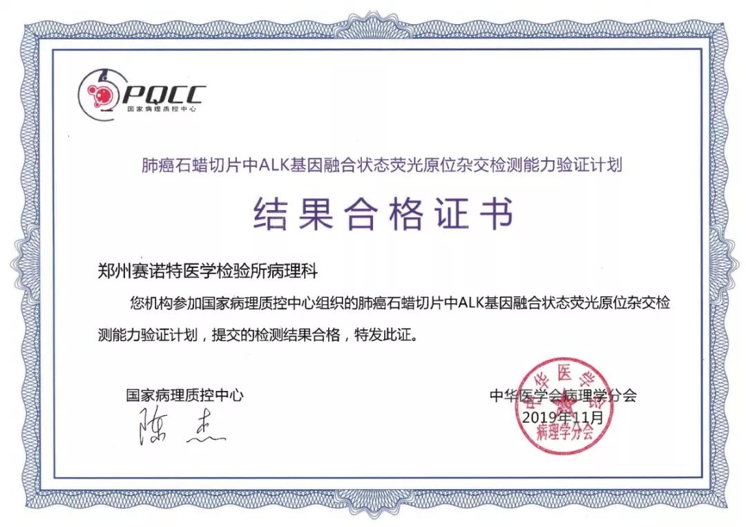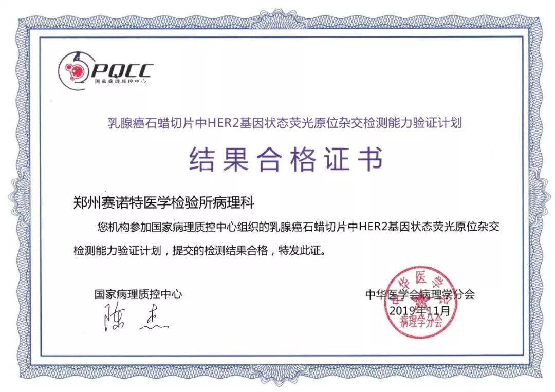 郑州赛诺特医学检验所荣获国家病理质控制中心(PQCC)颁发的室间质评证书。