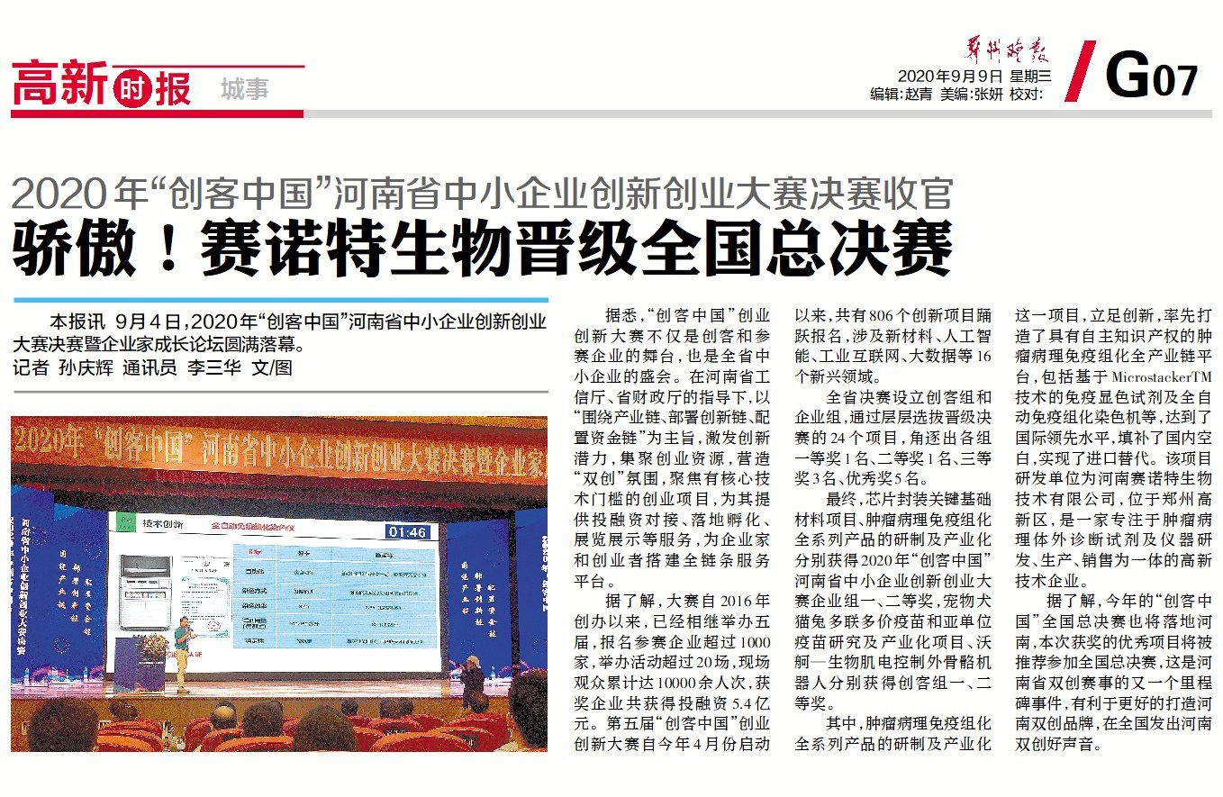 郑州晚报:骄傲!赛诺特生物晋级全国总决赛